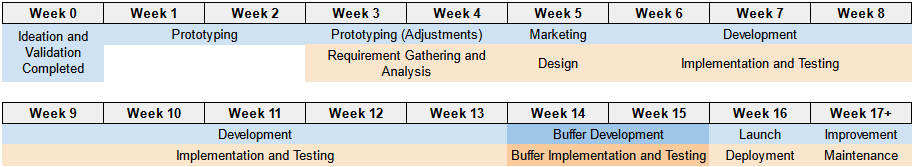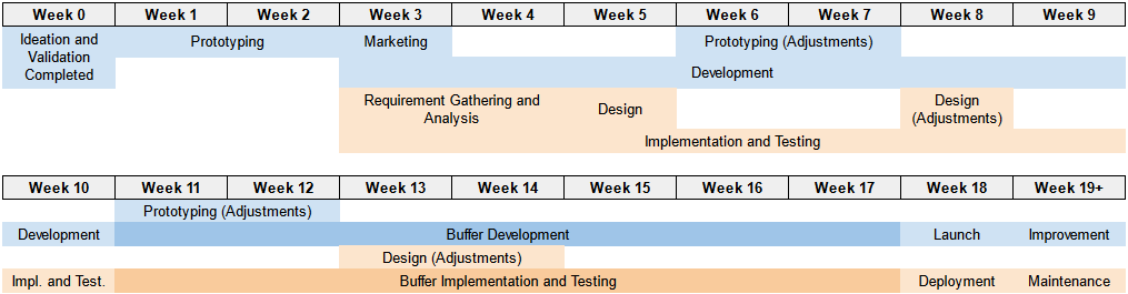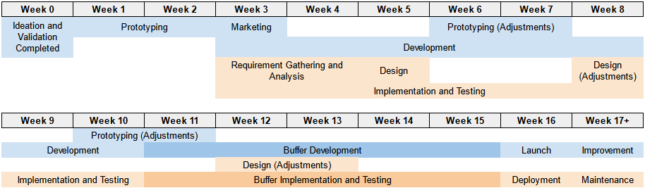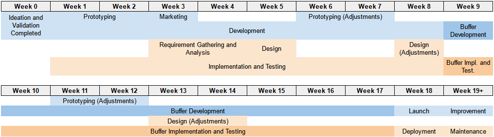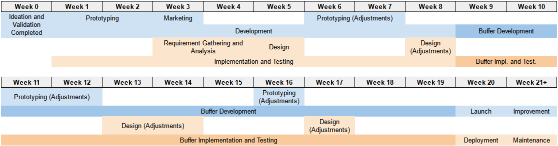 This scenario I hope you never find yourself in. When a project has no planning completed and it's high risk, a lot can go wrong. Suppose you find yourself working with new technology, complex, high-risk changes, new coding patterns, difficult-to-test features, or many unknowns. In that case, it is worth planning before starting the project to help reduce scope creep, tech debt, and pivoting during development. That being said, if taking this approach is necessary, we need the maximum amount of buffer time possible. The buffer for this project is 11 weeks which lands us at 19 weeks of development.